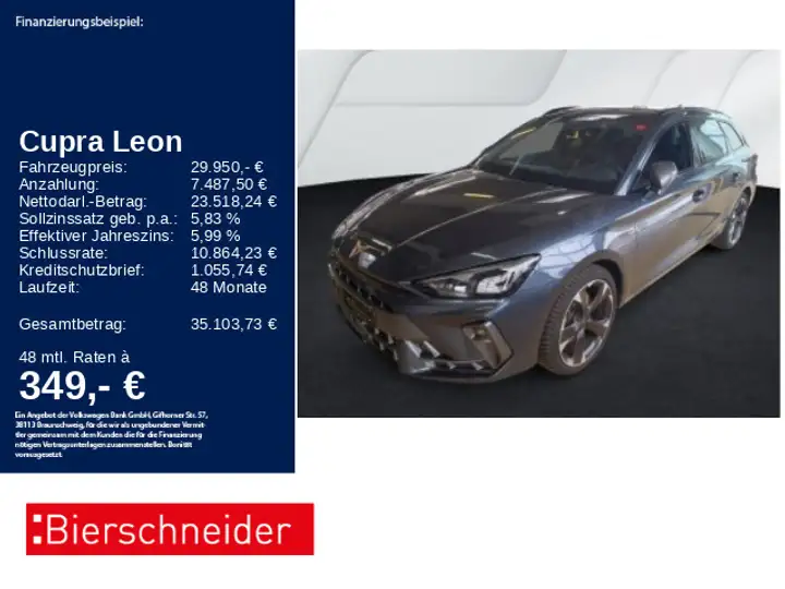 GARANTIE, ANSCHLUSSGARANTIE, Laufzeit 3 Jahre im Anschluss a. d. Herstellergar., max. Gesamtlaufl. 150.000 km, HIGHLIGHTS, NAVIGATIONSSYSTEM, LM-FELGEN 18 Zoll, ACTIVE-INFO-DISPLAY, RÜCKFAHRKAMERA, Handyvorbereitung, ASSISTENZ-SYSTEME, ACC-ABSTANDSGeschwindigkeits-Regelanlage-ADAPTIVE CRUISE CONTROL, Fernlichtassistent LIGHT ASSIST, FRONT ASSIST mit Fußgänger-und Radfahrererkennung, Müdigkeitserkennung, PARKLENK-ASSISTENT, SPURHALTE-, STAU- NOTBREMS-ASSISTENT, SPURWECHSELASSISTENT, VERKEHRSZEICHENERKENNUNG, ABBIEGE-ASSISTENT, AUSPARK-Assistent, Einparkhilfe PDC vorne und hinten, Ausweichunterstützung, INFOTAINMENT & MULTIMEDIA, DAB-Digitaler Radioempfang, INDUKTIONSLADEN für Smartphones (Kabelloses Aufladen), Wireless APP-CONNECT für Apple CarPlay und Android Auto, Sprachdialog-System, USB-Schnittstelle, APP-CONNECT: Darstellung von SmartphoneApps auf dem Touchscreen, RÄDER & REIFEN, Ganzjahres-Bereifung, FAHRWERK, Sportfahrwerk, KOMFORT, Mittelarmlehne vorn, 3-Zonen Klimaautomatik, SITZHEIZUNG vorne, Intelligent Speed Assist, Fensterheber elektrisch vorne + hinten, KLIMAAUTOMATIK mit zusätzlicher Bedienung im Fahrgastraum, Außenspiegel beheizbar, Außenspiegel el. anklappbar und mit Bordsteinautomatik, Außenspiegel elektrisch einstellbar, Innenspiegel automatisch abblendend, KEYLESS ADVANCED - Schlüssellose Zentralverriegelung, elektrische HECKKLAPPE mit virtuellem Pedal, Supersportlenkrad mit Schaltwippen beheizbar, Lendenwirbelstütze/n, INNEN-AUSSTATTUNG, Gepäckraum-Abdeckung, Einstiegleisten beleuchtet, Gepäckraumboden variabel höheneinstellbar, Rücksitzlehne geteilt umklappbar, Sitzhöhenverstellung vorne 2x, AUSSEN-AUSSTATTUNG, Dachreling schwarz, Abgedunkelte Scheiben ab B-Säule, LED-Rückleuchten, Metallic-Lackierung, LICHT & SICHT, LED-SCHEINWERFER, Nebelscheinwerfer, Lichtsensor / Regensensor, Ambientebeleuchtung, TECHNIK, DYNAMIKLENKUNG, Differenzialsperre, Reifendruckkontrolle, Fahrprofil-Auswahl, Servolenkung, 230-V-Steckdose, elektr. Wegfahrsperre, WEITERE AUSSTATTUNGEN, VORBEREITUNG FÜR ANHÄNGEVORRICHTUNG, UMWELT, Diesel-Partikelfilter (DPF), Start Stopp Anlage mit Rekuperation, GETRIEBE, 7-Gang-Automatikgetriebe, SICHERHEIT, FRONT-Airbags, INTERAKTIONS-Airbag vorne, KNIE-Airbag, KOPF-Airbags, SEITEN-Airbags hinten, SEITEN-Airbags vorn, Kindersitzverankerung i-Size und Top Tether, ABS - ESP, CENTER-Airbag, Alarmanlage, PreCrash, Radschrauben mit Diebstahlsicherung, Sonstiges, HU/AU neu bei Auslieferung, WINTERPAKET, CUPRA Connect Plus - 3 Jahre, Vorbereitung Alcohol Interlock, Parklenkassistent IPA (Intelligent Park Assist)