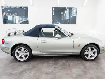Questa roadster del 2003 ha percorso solo 30.000 km! Il veicolo è in condizioni pari al nuovo, dalla carrozzeria dai rivestimenti alle plastiche e al vano motore, e presenta tutte le dotazioni specifiche della serie "Silver Blues". L'abbinamento tra la capote blu e la vernice "Cerrion Silver" è sbalorditivo, così come gli specifici cerchi in lega da 16 pollici a 5 razze, il volante e il pomello del cambio Nardi rivestiti in pelle, nonché gli inserti in alluminio e gli indicatori con quadrante bianco e cornici cromate.