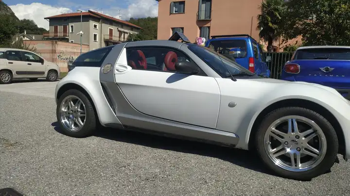Smart Roadster Coupè, carrozzeria riverniciata in ottime condizioni, cerchi da 16 simil Brabus + originali a tre razze, tetto in tela nuovo originale, vetri posteriori nuovi + una coppia da battaglia riverniciati e con alcuni attacchi a vite rotti ma utilizzabili, fanali posteriori nuovi, motore rifatto completamente con 15.000km circa percorsi, testata, pistoni, valvole, distribuzione, pompa acqua ecc... tutto rifatto, bobine e candele nuove, coppa olio in plastica alettata con tappo di scarico, modifica filtro olio maggiorato su scambiatore anch'esso nuovo, attuatore frizione Sasch nuovo, valvola blow-off Forge, tubazioni aspirazione in silicone Forge, filtro k&n, turbina con circa 30mila km, batteria nuova, tubi freno in treccia e dischi anteriori baffati. Pompa benzina Pierburg nuova e guarnizione nuova originale. Tetto e montanti removibili a prova di temporale, non entra acqua. Fari anteriori con lampade anabbagliante led.