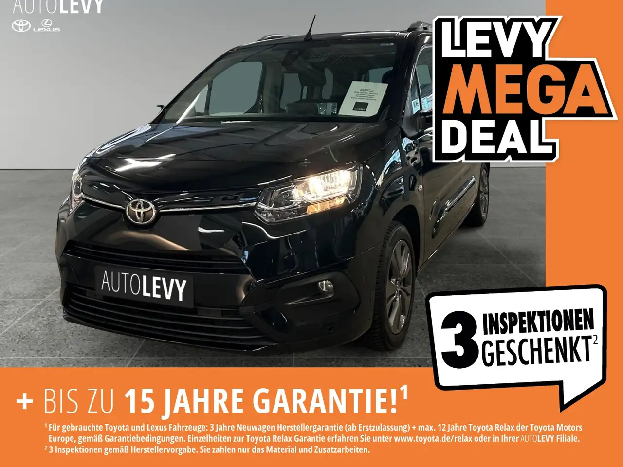 - Bis zu 15 Jahre Garantie (3 Jahre Neuwagenherstellergarantie und max. 12 Jahre Toyota Relax Anschlussgarantie der Toyota Motor Europe - gemäß Garantiebedingungen unter www.toyota.de/relax) und ON TOP 3 Inspektionen (Details siehe autolevy.de/garantieversprechen) geschenkt. Inspektion gem. Herstellervorgabe zzgl. Material und Zusatzarbeiten – nur gültig in unseren Filialen.