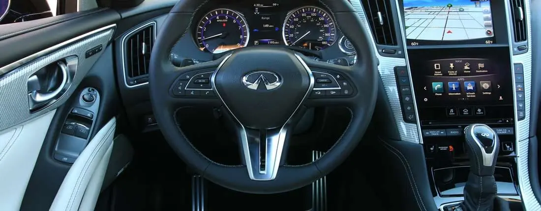 - L’Infiniti Q60 Premium Tech : Avec son régulateur de vitesse intelligent ICC, votre véhicule vous protégera des risques d’accident, quelle que soit la vitesse que vous adopterez. En plus de cela, il est aussi équipé d’un système de reconnaissance d’angle mort et d’un dispositif qui vous prévient les collisions en manœuvre de marche arrière.
