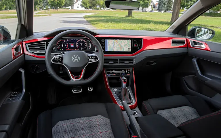 A bord, la Volkswagen Polo GTI est particulièrement mature, avec un tableau de bord soigné qui combine les dernières technologies de VW avec des boutons encore physiques pour contrôler la climatisation et les modes de conduite, entre autres (ce qui est un plus par rapport à sa grande sœur, la Golf). La GTI est dotée de sièges sport et de touches de couleur rouge, mais pour le reste, on n’a pas l'impression d'être dans une version sportive. Une bonne chose cependant : le frein à main traditionnel est toujours présent ! Le facelift a apporté une mise à jour de l'écran d'infotainment, ainsi qu'un nouveau volant avec des boutons tactiles.